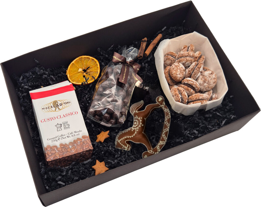 Šis dovanų rinkinys subalansuotas taip, kad vienoje dėžutėje suderintų kokybę ir šventišką jaukumą. Tai praktiška ir skani dovana, kuri pradžiugins kiekvieną. Į rinkinį įeina: Malta kava „Espresso Latino“ 250 g Maroni sausainiai 190 g Dražė saldainiai 140 g Dekoruotas šventinis meduolis „Arkliukas“